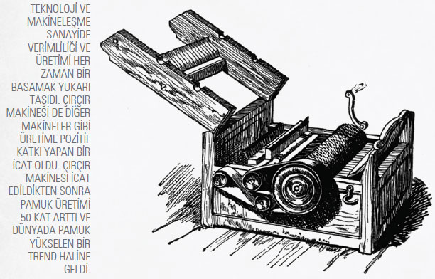 Aslında ilk çırçır makinesi Eli Whitney’in icadından yüzyıllar öncesine dayanıyor fakat bu ürün daha yöresel şartlara uygun bir makineydi. Hindistan’da üretilen bu makinenin özelliği tohumun geçemeyeceği kadar dar bir aralık bırakılarak yan yana yerleştirilmiş, elle döndürülen iki makarası olmasıydı. Bu dar aralıklar her ne kadar Hint pa - muğunun kısa lifli kozalarını ayırmada işe yarasa da dünya üzerindeki diğer uzun lifli pamuk tohumları için uygun değildi. Whitney’in modern çırçır makinesi ise üstünde metal bir ızgaranın içine doğru uzanan 1,2 santimetre arayla yerleştirilmiş ince dil dizileri bulunan bir tahta silindirden oluşuyordu. Diller, ızgaradan geçerken lifleri çekip tohumları bırakıyor, daha sonra bu diller, toplama fırçasıyla temizleniyordu.