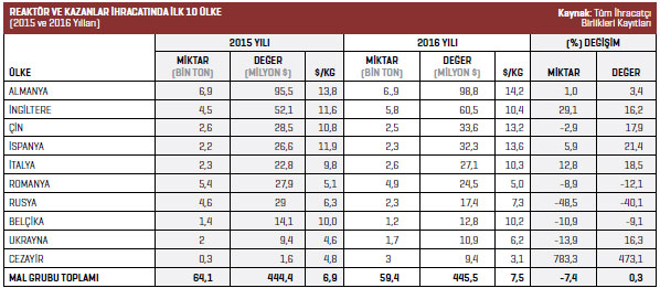 Reaktör ve kazanlar ihracatı 2016 yılının Ocak-Aralık döneminde 445,5 milyon dolar olarak kayda geçti. 2015 yılının aynı döneminde bu rakam 444,4 milyon dolar seviyesindeydi.