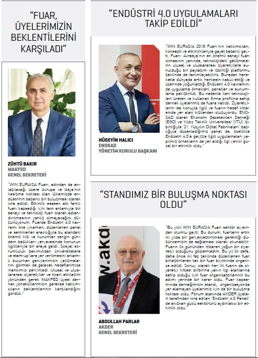 Uluslararası firmaların; robot, otomasyon teknolojisi, IT çözümleri ve yazılımların yanı sıra network platformlarını de sergilediği WIN EURASIA, 360 derece imalat sanayisinin tüm bileşenlerini bir araya getirdi. Sac işlemeden metal şekillendirme teknolojilerine; otomasyon hizmetlerinden elektrik ve elektronik ekipmanlara; hidrolik ve pnömatik hizmetlerden tesis içi lojistiğe kadar geleceğin fabrikaları için ihtiyaç duyulan tüm eko-sistem fuarda sergilendi. Endüstri 4.0 odaklı özel konseptiyle hayata geçirilen özel alanları ve yeni uygulamalarıyla dünya sanayi devlerini buluşturan fuar kapsamında, MAKFED üyesi makine alt sektör derneklerinden AKDER, ENOSAD VE İSDER çeşitli konu başlıkları çerçevesinde panel ve toplantılar düzenledi.
