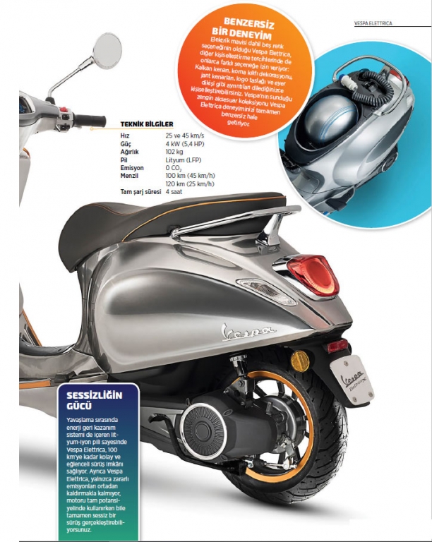 Motosiklet dünyasının en köklü markalarından Vespa, Elettrica modeliyle motosiklet dünyasına yepyeni bir soluk getirmeye hazırlanıyor. Yıllardan beri süregelen ikonik Vespa tasarımını, yenilikçi detaylarla harmanlayan Vespa Elettrica, modele özgü gövde rengi ve mavi renk detaylarıyla ön plana çıkıyor. Ancak Vespa Elettrica’yı Türkiye’de satın almak isteyen müşterilerin bir süre daha sabırlı olması gerekiyor: Yapılan açıklamalar 2019 yılında Vespa Elettrica’nın Türkiye’de de satışa sunulacağına işaret ediyor. Türkiye satış fiyatı henüz belli olmayan Vespa Elettrica, 45 km/s ortalama hız ile 100 km sürüş menzili vaat ederken, 4 saatte tam şarja olanak veren lityum-iyon pil 5,4 beygirlik güç üretiyor. Yavaşlama sırasında bataryayı yeniden şarj eden kinetik enerji geri kazanım sistemine de sahip olan Vespa Elettrica, tamamen sessiz ve 0 emisyonlu temiz bir sürüş imkânı sağlıyor.