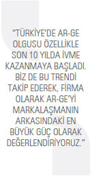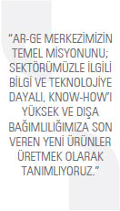 Bilgi çağı olarak nitelendirdiğimiz günümüzde ürettiğiniz ürünlere katabildiğiniz bilgi ve inovasyona paralel olarak kazancınız, sektörde kalıcılığınız ve rekabet etme gücünüz artmaktadır. Bunun yolun da doğal olarak disiplinli ve sistematik olarak yürütülen Ar-Ge faaliyetlerinden geçmektedir. Ayrıca firma olarak Ar-Ge’yi markalaşmanın arkasındaki en büyük güç olarak görmekteyiz. Ülkemizde Ar-Ge olgusu özellikle son 10 yılda ivme kazanmaya başladı. Ar-Ge kültürümüzün tam anlamıyla oturması için zamana ihtiyacımız olduğu kanaatindeyiz. Bu amaçla ülkemizde buna yönelik eğitimlere ilkokul sıralarında başlanmasının iyi olacağı düşüncesindeyiz. Bununla birlikte ihracata yönelik ve katma değeri yüksek ürünlerle ilgili Ar-Ge faaliyetleri desteklerinde bürokrasinin azaltılması sanayiciyi daha cesaretlendirecektir. Ar-Ge merkezlerinde en sık karşılaşılan sorunların başında ise nitelikli personel ihtiyacı gelmektedir. Bu sorunların verimli bir şekilde çalışan üniversite-sanayi iş birliği mekanizmaları ile çözülebileceğini düşünüyoruz.