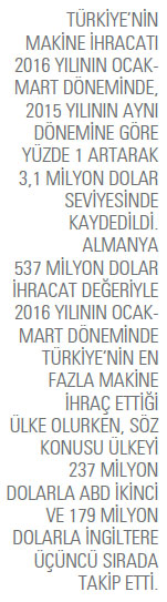 Makine sektöründe en fazla ihracat gerçekleştirilen ilk 10 ülke listesinin ilk sırasında Almanya alıyor. Almanya’ya 2015 yılının Ocak-Mart döneminde 507 milyon dolarlık ihracat gerçekleştirilirken 2016 yılının aynı döneminde bu rakam yüzde 6 artışla 537 milyon dolar oldu. İkinci sıradaki ABD’ye yönelik makine ihracatı 2016 yılının Ocak-Mart döneminde 237 milyon dolar oldu. 2015 yılının aynı döneminde bu rakam 222 milyon dolardı. ABD’ye yönelik ihracat artışı yüzde 7,1 olarak kaydedildi. Türkiye’nin en fazla ihracat gerçekleştirdiği ilk 10 ülke listesinin üçüncü sırasındaki İngiltere’ye 2016 yılının Ocak-Mart döneminde ihraç edilen ürünlerin değeri 179 milyon dolar oldu.