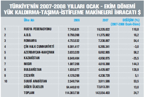 BU SEKTORDE DE CİN DUNYAYA MEYDAN OKUYOR Birleşmiş Milletler (BM) İstatistik Bölü mü verilerine göre 2007 yılında yük kaldırma, taşıma ve istişeme makineleri sektörü toplam ihracatı, bir önceki yıla göre yüzde 24 oranında artış göstererek 58 milyar dolar değerini aşmış durumda. Dünya yük kaldırma, taşıma ve istişeme makineleri ihracatında ilk sırada Almanya yer alıyor. Bu ülkeyi Çin ve ABD takip ediyor. Türkiye ise 2007 yılında sektör ihracatında 35. sırada yer aldı. Yük kaldırma, taşıma ve istişeme makineleri ihracatı yapan ilk 10 ülke arasında en fazla ihracat artışı yüzde 43 ile Çin’de gözlendi. Söz konusu ülkenin dünya sektör ihracatı içerisindeki payı yüzde 9,7 düzeyine yükseldi.