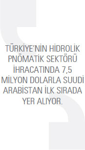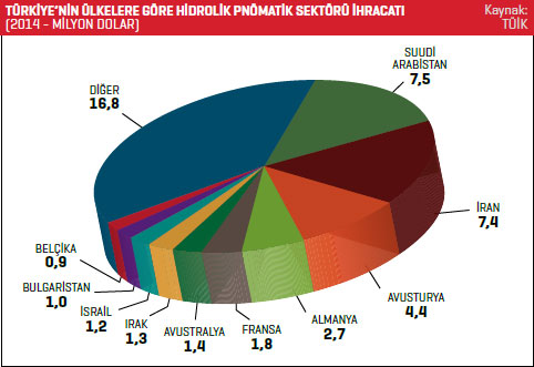 TÜİK verilerine göre Türkiye’nin hidrolik pnömatik sektörü ihracatı 2014 yılında, bir önceki yıla oranla yüzde 9,2 artarak 46,4 milyon dolar olarak kaydedildi. 2013 yılında bu rakam 42,5 milyon dolardı. Türkiye 2014 yılında en fazla Suudi Arabistan’a ihracat gerçekleştirdi. 2013 yılında Suudi Arabistan’a 6 milyon dolarlık ihracat gerçekleştirilirken bu rakam, 2014 yılında yüzde 25,3 artarak 7,5 milyon dolar seviyesine yükseldi. Listenin ikinci sırasında ise İran bulunuyor. Türkiye’nin İran’a yönelik ihracatı 2014 yılında 7,4 milyon dolar oldu. 2013 yılında bu rakam 4,7 milyon dolardı. İran’a yönelik hidrolik pnömatik sektörü ihracatı yüzde 58,3 arttı. Listenin üçüncü sırasında bulunan Avusturya’ya 2013 yılında 5,6 milyon dolarlık ihracat gerçekleştirilirken 2014 yılında bu rakam yüzde 21,3 azalarak 4,4 milyon dolar seviyesinde kaydedildi. Türkiye’nin 2014 yılında hidrolik pnömatik sektörü ürünü ihracatını yüzde 171,6 ile en fazla artırdığı ülke ise İsrail oldu. Türkiye 2014 yılında en fazla doğrusal hareketli hidrolik güç motorları (silindirler) kaleminde ihracat gerçekleştirdi. 2013 yılında söz konusu mal grubunda 32,4 milyon dolarlık ihracat gerçekleştirilirken bu rakam, 2014 yılında yüzde 8,1 artarak 35 milyon dolara yükseldi. Listenin ikinci sırasında yer alan diğer hidrolik güç motorları, makineleri ürün grubunda 2014 yılında gerçekleştirilen ihracatın değeri 7,7 milyon dolar olarak kaydedildi. 2013 yılında bu rakam 7,5 milyon dolardı. Diğer hidrolik güç motorları, makineleri ürün grubundaki ihracat yüzde 3,1 arttı. Listenin üçüncü sırasındaki doğrusal hareketli (silindirler) pnömatik güç motorları kalemindeki ihracat 2013 yılında 2,2 milyon dolar seviyesindeyken, 2014 yılında bu rakam yüzde 47,1 artarak 3,2 milyon dolar oldu.