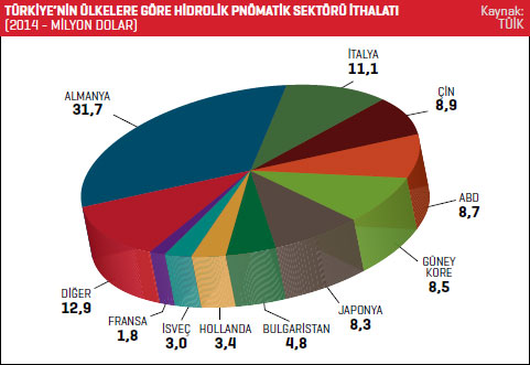 TÜİK verilerine göre Türkiye’nin hidrolik pnökomatik sektörü ithalatı 2013 yılında 95,5 milyon dolarken bu rakam, 2014 yılında yüzde 7,9 artarak 103,1 milyon dolar olarak kaydedildi. Türkiye 2014 yılında 31,7 milyon dolarla en fazla Almanya’dan ürün ithal etti. 2013 yılında söz konusu ülkeden gerçekleştirilen ithalatın değeri 24,3 milyon dolardı. Türkiye’nin 2014 yılında Almanya’dan gerçekleştirdiği ithalat yüzde 30,4 arttı. Listenin ikinci sırasında bulunan İtalya’dan 2013 yılında 11,3 milyon dolarlık hidrolik pnömatik sektörü ürünü ithal edilirken bu rakam, 2014 yılında yüzde 1,9 azalarak 11,1 milyon dolar olarak kaydedildi. Üçüncü sırada bulunan Çin’den 2014 yılında 8,9 milyon dolar değerinde ürün ithal edildi. 2013 yılında Türkiye’nin söz konusu ülkeden gerçekleştirdiği ithalat 10,7 milyon dolardı. 2014 yılında Türkiye’nin Çin’den gerçekleştirdiği hidrolik pnömatik sektörü ithalatı yüzde 16,4 azaldı. Türkiye’nin 2014 yılında hidrolik pnömatik sektörü ürünleri ithalatını en fazla artırdığı ülke yüzde 104,1 ile Hollanda oldu. Hollanda’dan 2013 yılında 1,6 milyon dolar değerinde ürün ithal edilirken 2014 yılında bu rakam 3,4 milyon dolar değerine yükseldi. Türkiye 2014 yılında en fazla diğer hidrolik güç motorları, makineleri kaleminde ithalat gerçekleştirdi. Söz konusu ürün grubunda 2013 yılında 40,4 milyon dolarlık ithalat gerçekleştirilirken bu rakam 2014 yılında, yüzde 8,5 azalarak 37 milyon dolar oldu. Listenin ikinci sırasında bulunan doğrusal hareketli hidrolik güç motorları (silindirler) kaleminde 2014 yılında 34,9 milyon dolar değerinde ithalat gerçekleştirildi. 2013 yılında bu rakam 26,8 milyon dolardı. Doğrusal hareketli hidrolik güç motorları (silindirler) ürün grubundaki ithalat yüzde 30,4 arttı. Listenin üçüncü sırasındaki doğrusal hareketli (silindirler) pnömatik güç motorları kaleminde 2013 yılında 19,9 milyon dolar değerinde ithalat gerçekleştirilirken bu rakam 2014 yılında yüzde 13,3 artarak 22,5 milyon dolar seviyesinde kaydedildi.