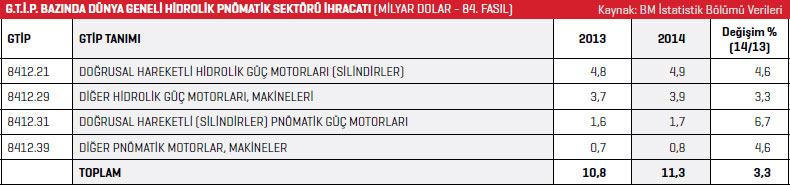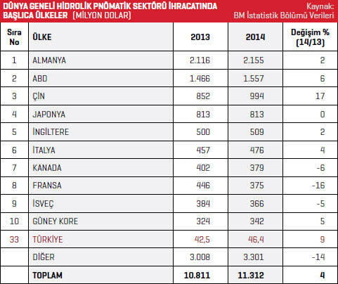 Birleşmiş Milletler (BM) İstatistik Bölümü verilerine göre, 2013 yılında 10,8 milyar dolar olan dünya geneli hidrolik pnömatik sektörü ihracatı, 2014 yılında yüzde 4 artarak 11,3 milyar dolara yükseldi. İhracat listesinin ilk sırasında bulunan Almanya, 2014 yılında 2,1 milyar dolar değerinde ürün ihraç etti. Almanya’nın ihracatı yüzde 2 arttı. Listenin ikinci sırasındaki ABD 2013 yılında 1,4 milyar dolar değerinde ihracat gerçekleştirirken, 2014 yılında bu rakam yüzde 6 artarak 1,5 milyar dolar olarak kayda geçti. Hidrolik pnömatik sektöründe en fazla ihracat gerçekleştiren ilk 10 ülke listesinin üçüncü sırasındaki Çin 2013 yılında 852 milyon dolar değerinde ihracat gerçekleştirdi. Çin’in ihracatı 2014 yılında yüzde 17 artışla 994 milyon dolar oldu. Türkiye, dünya geneli hidrolik pnömatik sektörü ihracatı listesinin 33. sırasında yer alıyor. Türkiye, 2013 yılında 42,5 milyon dolar değerinde ihracat gerçekleştirirken 2014 yılında bu rakam yüzde 9 artışla 46,4 milyon dolar oldu. En fazla ihracat gerçekleştiren ilk 10 ülke listesinde, 2013 yılına göre ihracatını en fazla artıran ülke ise yüzde 17 ile Çin oldu. BM İstatistik Bölümü verilerine göre, dünya ölçeğinde hidrolik pnömatik sektörü ithalatı 2014 yılında bir önceki yıla göre yüzde 6 arttı. 2013 yılında 11,8 milyar dolarlık ürün ithal edilirken 2014 yılında bu rakam 12,5 milyar dolar seviyesinde kaydedildi. ABD, 2014 yılında 2,4 milyar dolar rakamıyla ithalat gerçekleştiren ilk 10 ülke listesinin ilk sırasında yer aldı. ABD’nin 2013 yılı hidrolik pnömatik sektöründeki ithalatı 2,2 milyar dolar olarak kaydedilmişti. Söz konusu ülkenin 2014 yıl