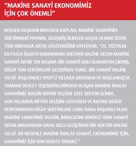 Mustafa Kaplan, makine sanayinin bir ülkenin gelişmişlik düzeyini belirleyen en önemli göstergelerden olduğunu söyledi. Kaplan:  “Makine ya da makine imalat sanayi, bütün dünyada ülkelerin gelişmişlik düzeylerinin en önemli göstergelerinden biri olduğundan son derece özel bir öneme sahiptir.”  Başkan Kaplan; makine sanayisinde faaliyet gösteren şirketlerin çoğunu büyük ve orta ölçekli KOBİ’lerin oluşturduğunun altını çizdi. Kaplan: Ayrıca makine sanayisinde faaliyette bulunan çoğu şirketin küçük ve  orta ölçekli işletmelerden, KOBİ’lerden  oluşması sektörü bizim için daha da özel hale getiriyor. Bu işletmelerimiz pek çok makine