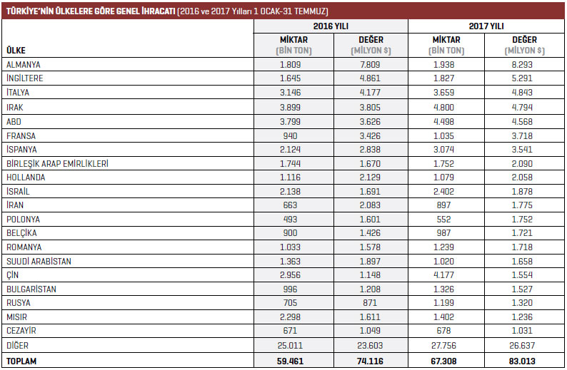 Hadde ve döküm makineleri mal grubunda 2017 yılının Ocak-Temmuz döneminde 27,1 milyon dolarla en fazla Almanya’ya ihracat gerçekleştirildi. 2016 yılının aynı döneminde bu rakam 17,9 milyon dolar seviyesindeydi. Almanya’ya yönelik ihracat artışı yüzde 51,8 oldu. Listenin ikinci sırasında yer alan Rusya’ya 2016 yılının Ocak-Temmuz döneminde 10 milyon dolarlık ihracat gerçekleştirilirken 2017 yılının aynı döneminde bu rakam yüzde 63,2 artışla 16,3 milyon dolar olarak kayda geçti. Üçüncü sıradaki İran’a 2016 yılının Ocak- Temmuz döneminde yapılan ihracat 10,6 milyon dolardı. İran’a 2017 yılının Ocak- Temmuz döneminde yüzde 5,1 lik artışla 11,1 milyon dolar değerinde ürün ihraç edildi. Dördüncü sırada bulunan Bulgaristan’a 2017 yılı Ocak-Temmuz döneminde 10,5 milyon dolarlık ihracat gerçekleştirilirken listenin beşinci sırasındaki İtalya’ya ise 8,1 milyon dolarlık ihracat gerçekleştirildi.