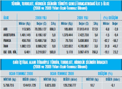 Ülkemiz türbinler, turbojetler ve hidrolik silindir ihracatı 2009 yılının Ocak-Temmuz döneminde geçtiğ imiz yılın eş zamanı na göre yüzde 6,1 oranında gerileme göstermiş durumda. Bu gerileme neticesinde 2008 yılının Ocak-Temmuz döneminde 134 milyon 451 bin dolar olan türbinler, turbojetler ve hidrolik silindir ihracatımız 2009 yılının aynı zaman dilimine gelindiğ inde yüzde 6,1 gerileme ile 126 milyon 250 bin dolar olarak gerçekleşti. Türkiye’nin en fazla türbinler, turbojetler ve hidrolik silindir ihracatı yaptığı ülkenin ise ABD olduğu görülüyor. Bu ülkeye 2008 yılının Ocak-Temmuz döneminde 79 milyon 265 bin dolarlık türbinler, turbojetler ve hidrolik silindir ihracatı söz konusu iken 2009 yılının aynı dönemine gelindiğ inde bu değ er yüzde 2,8 oranında gerileyerek 77 milyon 13 bin dolar oldu. Türbinler, turbojetler ve hidrolik silindir mal grubu ihracatı- mızdaki ikinci en büyük pazar ise Avusturya oldu. Avusturya’ya 2008 yılının Ocak-Temmuz döneminde 8 milyon 196 bin dolar türbinler, turbojetler ve hidrolik silindir ihracatımız varken 2009 yılının eş dönemi ne gelindiğinde 7 milyon 422 bin dolarlık ihracat gerçekleşti. Avusturya’nın ardından en fazla türbinler, turbojetler ve hidrolik silindir ihracatı yaptığımız üçüncü ülke ise Fransa oldu. Söz konusu ülkeye 2008 yılının Ocak-Temmuz döneminde 13. milyon 482 bin dolarlık türbinler, turbojetler ve hidrolik silindir ihracatı gerçekleştirilmişken 2009 yılının Ocak-Temmuz eş zamanına gelindiğinde ise yüzde 56 gerileme ile 5 milyon 830 bin dolar ihracat gerçekleştirildi. Türbinler, turbojetler ve hidrolik silindir ihracatımızda en fazla yükseliş ise Ege Serbest Bölgesinde yaşanmış. Ege Serbest Bölgesinden 2008 yılının Ocak-Temmuz döneminde 3 milyon 219 bin dolarlı k türbinler, turbojetler ve hidrolik silindir ihracatı yapılmışken 2008 yılının aynı dönemine gelindiğinde 3 milyon 967 bin dolarlık ihracat değ erine ulaşılarak yüzde 23,2’lik yükseliş yaşanmı ş. Türbinler, turbojetler ve hidrolik silindir ihracatındaki en fazla ihracat artışı- nın yaşandığı ülkelere bakıldığı nda ise İsviçre, Almanya ve Türkmenistan olarak sıralanıyor.