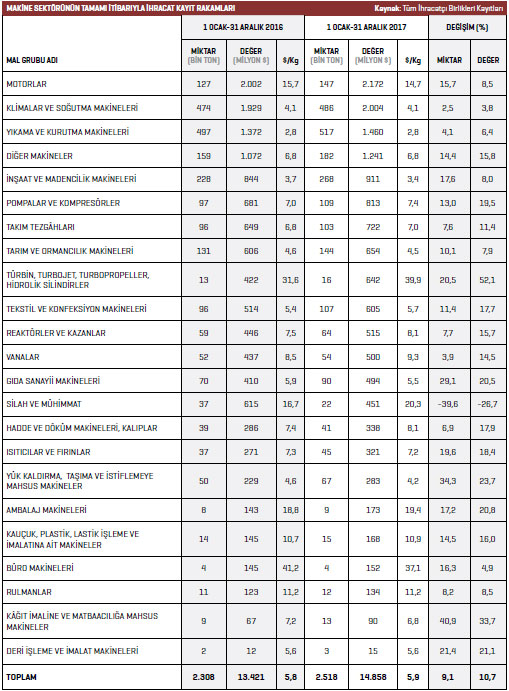 Makine sektöründe 2017 yılında en fazla ihracat gerçekleştiren alt sektör motorlar oldu. 2016 yılında söz konusu ürün grubunda gerçekleştirilen ihracat 2 milyar dolar seviyesindeyken 2017 yılında bu rakam yüzde 8,5 artışla 2,1 milyar dolar olarak kaydedildi. Listenin ikinci sırasında bulunan klimalar ve soğutma makineleri kaleminde 2017 yılında gerçekleştirilen ihracat bir önceki yıla göre yüzde 3,8 artışla 2 milyar dolar oldu. 2016 yılında söz konusu ürün grubundaki ihracat 1,9 milyar dolardı. 2017 yılında makine sektöründe en fazla ihracat gerçekleştiren üçüncü kalem ise 1,4 milyar dolarla yıkama ve kurutma makineleri olarak kaydedildi. Söz konusu mal grubunda 2017 yılında bir önceki yıla göre ihracat yüzde 6,4 artış kaydetti. Yıkama ve kurutma makineleri kaleminde 2016 yılında 1,3 milyar dolarlık ihracat gerçekleştirilmişti.