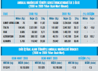 Ülkemiz ambalaj makineleri ihracatı 2008 yılının Ocak-Mart dönemine göre 2009 yılının aynı zaman dilimi ile karşılaştırıldığı ndan yüzde 7,5 oranında düşüş göstermiş. 2008 yılının Ocak-Mart ayları arasından 18 milyon 153 bin dolar olan ambalaj makineleri ihracatımız 2009 yılının aynı dönemine gelindiğ inde 16 milyon 789 bin dolara gerilemiş. Ambalaj makineleri ihracatımız ülkeler bazı nda incelendiğinde ise ilk sı- rada Güney Afrika Cumhuriyeti’nin yer aldığı görülüyor. Güney Afrika Cumhuriyeti’ne 2008 yılının ilk 3 ayında ihracat neredeyse yokken 2009 yılının aynı dönemine gelindiğinde 2 milyon 234 bin dolar rakamına ulaşılmış. Güney Afrika Cumhuriyeti’nin ardından en fazla ambalaj makineleri ihracatı gerçekleştirdiğimiz ikinci ülke ise İtalya olmuş. Söz konusu ülkeye 2009 yılının ilk 3 aylık döneminde 2 milyon 47 bin dolarlı k ambalaj makineleri ihracatı gerçekleştirilmiş. Irak ise ambalaj makineleri ihracatımı- zın üçüncü en büyük pazarı olmuş. Irak’a yönelik olan ambalaj makineleri ihracatımız 2009 yılının ilk 3 aylık döneminde 1 milyon 402 bin dolar olarak kaydedilmiş. Ambalaj makineleri ihracatımız ülkeler bazında ihracat artış hızı oranlarına göre değerlendirildiğinde ise Güney Afrika Cumhuriyeti, Irak ve Almanya’nın ardından İran’ın yüzde 201,4 oranında artış hızı oranıyla dördüncü sı- rada yer aldığı görülüyor. Söz konusu ülkeye 2008 yılının Ocak-Mart döneminde 227 bin dolarlık ambalaj makineleri ihracatı varken 2009 yılının aynı dönemine gelindiğinde ise 684 bin dolarlık ihracat rakamı yakalanmı ş. Azerbaycan’da ambalaj makineleri ihracat artış oranımızın yüksek olduğu pazarlardan biri konumuna yükselmiş. Azerbaycan’a 2008 yılı- nın Ocak-Mart döneminde 389 bin dolarlık ambalaj makineleri ihracatı gerçekleştiren Firmaları mız 2009 yılının Ocak-Mart döneminde ise yüzde 193,7 oranında değer artışı ile 1 milyon 142 bin dolar seviyesini yakalamışlar. Fotoğraf altı: Şinasi Şeker Ser-Ma Makine Şrma Ortağı Mart ayında ihracatımız olmadı. Kriz nedeniyle Mart 2009’da ihracatı mız olmadı. İç piyasada projeler durduruldu. Fuarlara katılarak bu durumu aşmaya çalı şıyoruz. Sektörün aslında üreticilerden kaynaklanan bir sorunu var, kriz ortamına bağlamadığı- mız. Bu yerli üreticilerle alakalı değil. Sektörel bazda makine tadilatı veya yeni proje alabilecekken kriz nedeniyle pek çok üretici bu projelerini askıya aldı. Krizin 2010’un ikinci veya üçüncü çeyreğ inde etkisini kaybedeceğini düşünüyoruz. Bu dönemde bazı düzelmeler görülebilir. Finansal olarak 2009 daha sıkıntılı geçecek. İç piyasa ile alakalı olarak ise Türkiye’de yatırımların durduğ unu söyleyebilirim. Ancak yine de proje bazında talepler var yabancılardan. Kriz ortamından kurtulabilmek için tüm dünyada krizin bitmesini bekleyeceğiz. Tabi bu esnada verilebilecek devlet destekleri çok önemli. ÖTV indirimi yapılabilir. Maliyetlerle alakalı olarak bu indirimler fiyatları çok etkiliyor. Bu durum tedarikçilerin bize verdiği malzemeyi de etkiliyor. Sektörel bazda bakarsak ise ambalaj makineleri sektörü bu yıl Ocak-Mart döneminde yaklaşık 16 milyon dolarlık bir ihracat rakamı na ulaştı. Bu rakam 2008 Ocak-Mart döneminde yaklaşık 18 milyon dolar civarındaydı. Tüm kriz ortamına rağmen genel olarak yüzde 7,5’lik bir düşüş yaşandı. Bu da diğer sektörlerle kı- yaslandığında çok kötü bir durum değil.