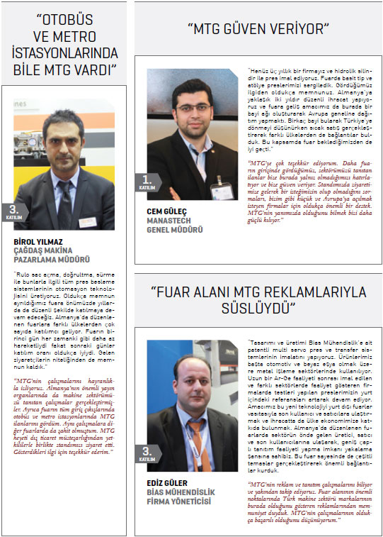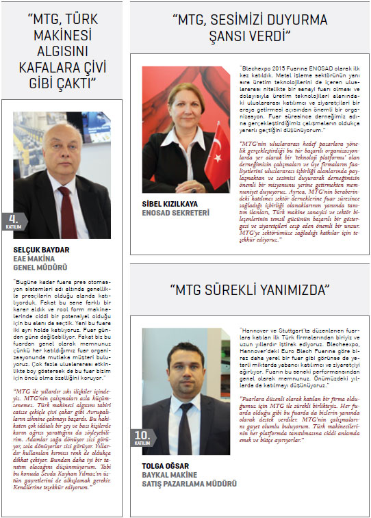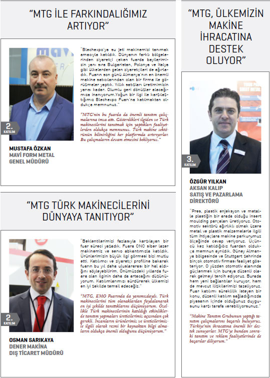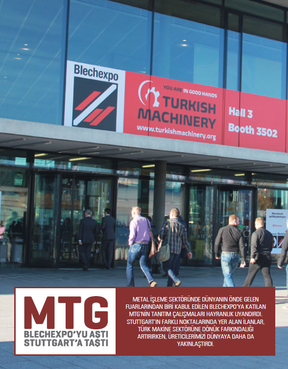 İki yılda bir düzenlenen Blechexpo Fuarına bu yıl 36 ülkeden 1234 firma katıldı. MTG, 38 bin kişinin ziyaret ettiği fuarın 3’üncü holündeki 30 metrekarelik stantta, fuar katılımcılarını ve ziyaretçileri Türk makine sektörü hakkında bilgilendirdi. MTG ayrıca Türk makinesinin görünürlüğünü artırmak için fuar girişiyle fuar alanındaki pankartlar ve boardlara, şehir merkezinde çalışan 10 otobüs ve 10 tramvaya, fuar gazetesine, fuarla eş zamanlı olarak Almanya’da yayınlanan sektörel dergilere; “We’re Highly Qualified And Standardized”, “We’re Closer Than You Think”, “We’re Young And Dynamic!” ve “We Have Entrepreneurial Spirit” sloganları çerçevesinde tasarlanan “Turkish Machinery” imzalı çok sayıda reklam verdi. Makine İhracatçıları Birliğinin (MAİB) Turquality projesi kapsamında hazırlatılan makine ekinin yer aldığı 3 Kasım tarihli Die Welt gazetesi de fuarın ilk günü katılımcı firmalara dağıtıldı. Fuarda ziyaretçileri, katılımcı Türk firmalarına yönlendirebilmek amacıyla stant yerlerini ve ürünlerini gösteren bir broşür de hazırlandı.