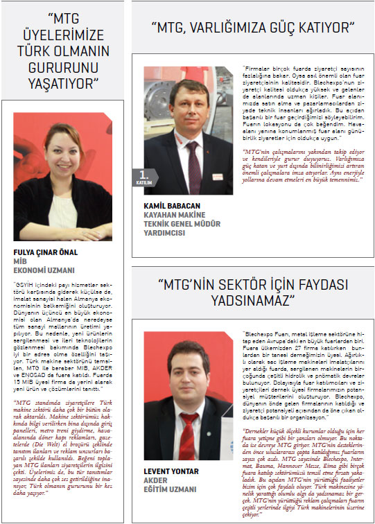 Yabancı ve Türk katılımcılarla ziyaretçilerin beğenisini kazanan tanıtım faaliyetleri, fuar süresince, Türk makine sektörünün metal işleme sektöründeki üretim gücü ve kalitesine vurgu yaptı. MTG standında Türk makine sektörünü tanıtan multivizyon, İngilizce ve Almanca olarak sürekli gösterildi. Bu yılki Blechexpo  Fuarına Türkiye’den 27 firma katılırken, firma sayısı bakımından Türkiye 36 ülke arasında dördüncü sırada yer aldı. MTG standında Makine İhracatçıları Birliği (MAİB) üyesi firmalara ait bilgiler içeren katalog, CD ve USB bellek dağıtıldı. Fuara MTG Uzmanı Aydan Işıl Aydın ve Orta Anadolu İhracatçı Birlikleri (OAİB) İhracat Uygulamaları Şubesi Şefi Özlem Yıldız Karaca katıldı. Fuara kendi firması ile katılan MTG Yönetim Kurulu Üyesi ve Almanya Sorumlusu Sevda Kayhan Yılmaz da MTG’nin çalışmalarına fuar süresince destek verdi. Ayrıca Makine İmalatçıları Birliği (MİB), Endüstriyel Otomasyon Sanayicileri Derneği (ENOSAD) ve Akışkan Gücü Derneği (AKDER), temsilcileri de MTG standında fuar ziyaretçilerine sektörleri ve üyeleri hakkında bilgilendirdi. Ekonomi Bakanlığı İhracat Genel Müdür Yardımcısı Hakan Kızartıcı da MTG temsilcileriyle fuar süresince Türk firmalarının standlarını ziyaret ederek çeşitli görüşmeler gerçekleştirdi.