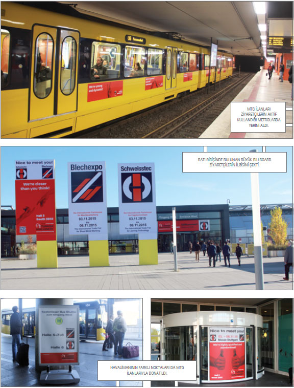 Almanya’nın Stuttgart kentinde 3-6 Kasım tarihleri arasında 13’ncü kez düzenlenen Blechexpo Fuarına katılan Makine Tanıtım Grubu (MTG), fuar alanı ve Stuttgart şehir merkezindeki önemli noktalara verdiği ilanlarla Türk makinesi algısının güçlendirilmesine katkıda bulundu.