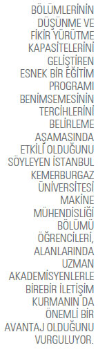 İstanbul Kemerburgaz Üniversitesi Makine Mühendisliği Bölümü’nün serbest ve alan seçmeli derslerde sunduğu geniş yelpazeyle çeşitli spesifik alanlara yönelerek kendilerini geliştirmelerine olanak sağladığını ifade eden mühendis adayları, iş hayatına adım atacakları günlerin heyecanını yaşıyor.