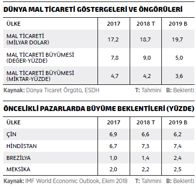 DÜNYA MAL TİCARETİNİN 2019 YILINDA MİKTAR OLARAK YÜZDE 3,6 GENİŞLEMESİ; PETROL, EMTİA VE MAL FİYATLARINDAKİ DURAĞANLAŞMAYLA BİRLİKTE DEĞER BAZINDA YÜZDE 5 BÜYÜMESİ BEKLENEN KÜRESEL TİCARETİN İSE 19,7 TRİLYON DOLARA ULAŞABİLECEĞİ ÖNGÖRÜLÜYOR. DÜNYA EKONOMİSİNDE YAVAŞLAMA VE KORUMACILIK ÖNLEMLERİ, MAL TİCARETİNDEKİ GENİŞLEMEYİ SINIRLANDIRABİLECEK ETKENLER OLARAK ÖNE ÇIKARKEN, BUNA BAĞLI KÜRESEL İHRACAT PERFORMANSININ 2017 VE 2018 YILLARININ ALTINDA KALACAĞI DA BEKLENEBİLİR. BU ÖNGÖRÜLER, TÜRKİYE İHRACATI İÇİN DE ÖNEMLİ BİR VERİ OLUŞTURUYOR.