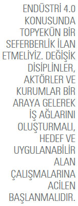 Endüstri 4.0 çok boyutlu bir konu; üretim ve üretim ilişkilerinde internet teknolojilerinin belirleyici olduğu ve bundan çıkarsama ile eskiden tanıdık olduğumuz sistemlerin, norm ve standartların değişim, dönüşüm yaşayacağı, enformasyon te knolojileri bahsinde güvenlik ve hukuk mevzuatının yeniden düzenlenmesine neden olacak kamusal bir ilişki de söz konusudur. Ayrıca “İnsan-İş” ilişkisinin yeniden dizayn ve formüle edileceği düzlemden bahsedebiliriz. Tüm bunlar akşamdan sabaha olacak şeyler değil muhakkak ama internet teknolojilerindeki hız göz önünde bulundurulduğunda yakın gelecekte bu yeni durumun belirleyici olacağını söyleyebiliriz. Endüstri 4.0 konusunda topyekun bir seferberlik gerekli. Değişik disiplinler, aktörler ve kurumlar bir araya gelerek iş ağlarını oluşturmalı, hedef ve uygulanabilir alan çalışmalarına acilen başlanmalıdır. Bu alanda çalışma yürüten ülkeler arasında konunun liderliği için mücadele başlamış durumda, herkes gardını alırken bu yeni dönem için partnerlerini de belirlemeye çalışıyor.