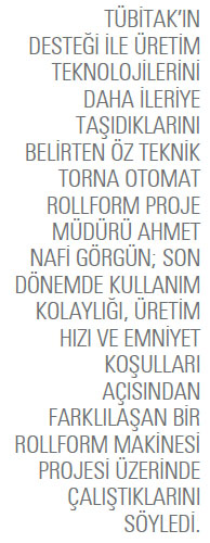 Öz Teknik Torna Otomat olarak bugün itibariyle üstünde çalıştıkları iki makine projesi bulunduğunu söyleyen Rollform Proje Müdürü Ahmet Nafi Görgün, “Bunlardan bir tanesi, TÜBİTAK ile yürüttüğümüz ‘Alüminyum Cam Çıta Profil Hattı Rollform Makinesi’ projesidir. Makine çıktısı ürün, ısıcamların arasında kullanılan alüminyum çıtalardır. Proje, piyasadaki rakiplerine göre gerek kullanım kolaylığı, gerek üretim hızı ve gerekse emniyet koşulları açısından benzersizdir. Diğer projemiz ise ‘CNC Torna ve Polygon Tezgahı’ üretimidir. Bu kapsamda tasarlanan makinelerimiz talaşlı imalat sektörüne hizmet vermesi planlanan genel makinelerdir” dedi.