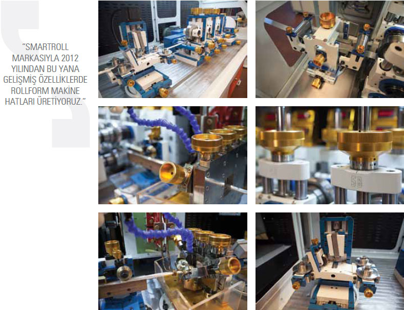 Makine imalatı alanında uzman bir firma olarak daha çok rollform makineleri üretimine önem veriyoruz. Bunun yanında CNC torna ve köşeleme tezgahları üretimi de yapıyoruz. Ürün gamımızda talaşlı imalat tezgahlarında kullanılan ve “takım” olarak adlandırılan hassas döner punta, tarama başlığı ve kater gibi ürünlerde yer alıyor. Bu kapsamda ayrıca beyaz eşya firmalarına yüksek adetlerde seri üretim gerçekleştiriyoruz. Rollform makinelerimizin öne çıkan özellikleri hakkında ise şunları söyleyebilirim: Makine genişliği yer kazanımında avantaj sağlayan patentli şanzıman kutusu, 0,01 hassasiyetle kalıp paralellik ve yükseklik ayarı, hareketlerin gözlemlenmesini sağlayan dijital göstergeleri, yüksek üretim hızları, kapakları otomatik açılıp kapanabilen pnömatik sistem emniyet kabini, kamera ile ürün akış kontrolü ve ürün akışını harici bir televizyondan izleyebilme, sert krom kaplı kaset kızak milleri, kaynaklı ürünler için, çok eksen hareket kabiliyetine sahip kaynak kafaları, soğutma sıvısı kullanılan hatlarda, ürün yüzeyini temizlemek için buharlı ya da buharsız sıcak hava ünitesi, hassas üretim sayesinde düşük fire oranları.
