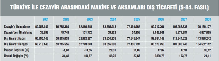 Geçtiğimiz yılın son çeyreğine girilirken patlak veren küresel iktisadi krizin etkileri kendini tüm sektörlerde gösterirken makine ve aksamlarında artış göz doldurdu. 84’üncü fasıl itibariyle ise Türkiye İstatistik Kurumu (TÜİK) verilerine göre; Cezayir ile Türkiye arasındaki makine ve aksamları dış ticaret hacmi, son 5 yılda artış gösterirken, ülkemiz ile Cezayir arasındaki makine sektörü dış ticareti, devamlı olarak fazla verdi. 84’üncü fasıl itibariyle, 2008 yılında Cezayir’e yönelik makine ve aksamları ihracatı yüzde 30,1 artış gösterirken, ithalat yüzde 21,1 düşüş gerçekleşti. İhracat, 2001 yılı seviyesinin iki katının üzerine çıkarken, ithalattaki artış çok daha fazla oldu. 2008 yılında Türkiye’nin Cezayir’e OAİB iştigal alanı itibariyle makine ve aksamları ihracatı, bir önceki yıla kıyasla yüzde 39 artarak 91,8 milyon dolar olarak gerçekleşti. Yine OAİB iştigal alanı bazı nda, Türkiye’nin makine sektörü ihracatı ndan yüzde 1,3’lük pay alan Cezayir, Türkiye’nin sektör ihracatı yaptığı 25’inci ülke konumunda olmakla birlikte potansiyel arz eden bir pazar. İhracatçı Birlikleri kayıtlarına göre, 2009 yılı Ocak ayında OAİB iştigal alanı itibariyle Cezayir’e makine ve aksamları ihracatı yüzde 31,1 artışla 7,2 milyon dolar seviyesinde kaydedildi. 2008 Ocak ayında Cezayir, sektör ihracatı yapılan ülkeler arasında 27’inci sırada yer alırken, 2009 yılı Ocak ayında ise 15’inci ülke konumuna yükseldi.