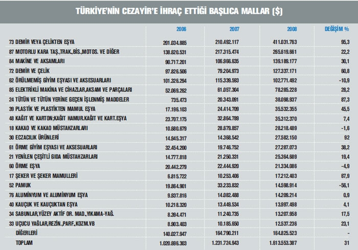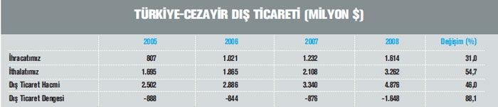Türkiye’nin Cezayir’e yönelik ihracatında son yıllarda önemli artışlar yaşandığı görülüyor. 2008 yılında 1,6 milyar dolar ihracata karşılık, Cezayir’de 3,3 milyon dolara yakın ithalat yapılmış. Ayrıca, son dönemde Cezayir’e yönelik ihracatta kaydedilen gelişmeler ve Cezayir’den yapılan ithalatta oluşan artışlar sonucunda, iki ülke arasındaki dış ticaret hacminin de 4,9 milyar dolara ulaştığı görülüyor. 2008 yılı itibariyle Cezayir, Türkiye’nin genel ihracatında 21’inci ülke konumunda iken, genel ithalatında ise 16’ncı sırada yer alıyor. İki ülke arası nda dış ticaretin daha yakından incelenmesi amacıyla mal grupları bazında verilere bakıldığında; 2008 yılı itibariyle özellikle demir veya çelikten eşya, motorlu kara taşıtları, makine ve aksamları, demir ve çelik ve örülmemiş giyim eşyası nın, Türkiye’nin Cezayir’e ihracatı yapılan başlıca ürünler olduğu görülüyor. Madde bazında ele alındığında, çok çeşitli Türk ürününün Cezayir pazarında satışa sunulduğu ve bunlar içerisinde paslanmaz çelikten gaz/petrol boru hattı nda kullanılan borular, motorlu taşıtlar, köşeli çubuklar, ev tipi buzdolapları, erkek/erkek çocuk için kısa pantolon, şort vs., dizel motorlu taşıtlar, hijyenik havlular, tamponlar, bebekler için bezler vb., L şeklinde profiller (sıcak haddelenmiş), kadın/kız çocuk için pantolon şort vs., dizel/yarı dizel motorlu toplu yolcu taşıtları, demir/çelikten kuleler ve pilonların yer aldığı görülüyor. Diğer taraftan, kayıt dışı ekonomi kapsamında değerlendirilen bavul ticareti yoluyla da yıllık yaklaşık 100-150 milyon dolar tutarı nda bir ihracat gerçekleştirildiği tahmin ediliyor. Bunun yanı sıra İspanya, Fransa ve İtalya limanları üzerinden Türkiye menşeli malların “re-export” yoluyla veya Magrep Birliği üyesi ülkelerden transit olarak Cezayir’e geldiği ve bu ticaretin yıllık toplamının yaklaşık 300-350 milyon dolar civarında bir rakama ulaştığı tahmin ediliyor.