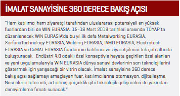 WIN EURASIA’da katılımcı ve ziyaretçileri buluşturan geniş fuar alanının yanı sıra Endüstri 4.0 için de çok geniş bir deneyim alanı sunacağız. Fuarlar, ticaretin olduğu kadar bilgi ve deneyimin de merkez üssü haline gelmeliler. Biz WIN EURASIA’da buna çok önem veriyoruz. Bu doğrultuda Endüstri 4.0 için özel bir deneyim alanı oluşturduk. Shunk, Durmazlar, Hydac, Hid-Tek, Eravis, Alitek, Oppent gibi dünya devi markaların katılımlarının şimdiden kesinleştiği Endüstri 4.0 için ayrılan bu özel alanda yerli ve yabancı katılımcı firmalarımız son teknoloji ürün ve hizmetlerini İstanbul’da tanıtma fırsatı bulacak. İmalat sanayiine 360 derece bakış açısı sağlamayı amaçladığımız fuarda katılımcılarımız otomasyon, dijitalleşme, Nesnelerin İnterneti, artırılmış gerçeklik gibi teknolojik gelişmeleri de yakından deneyimleme fırsatı sunacak. Endüstri 4.0 odaklı özel konseptiyle hayata geçirilen özel alanları ve yeni uygulamalarıyla WIN EURASIA dünya sanayi devlerinin son teknolojilerini göstermek için yarışacağı bir vitrin olacak. WIN EURASIA’da oluşturduğumuz özel deneyim