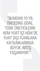 Türk firmalar da özellikle son yıllarda fuarların bu avantajından daha yoğun faydalanıyor. Bundan 10 yıl öncesine göre, Türk üreticilerin hem yurt içi hem de yurt dışı fuarlara katılımlarında büyük artış yaşanıyor. Fuarları iş yaratmak için kullanma noktasında Türkiye’de çok etkin bir yapı var. Tabii bu noktada devlet desteği de çok önemli bir rol oynuyor. Bakanlık ulusal ve uluslararası tüm fuarlara katılımları teşvik etmek amacıyla katılımcılara büyük destek sağlıyor. Kendine özgü bir formül üreterek farklılaşma, fuar katılımlarında önemli bir yere sahip. Türkiye’deki firmaları göz önüne aldığınızda, bunu ne kadar başardığımızı söyleyebiliriz. Uluslararası rekabet koşulları altında, bir firmanın ya da bir ürünün benzerlerinden farklılaşma noktasında sürekli düşünmesi, yeni stratejiler geliştirmesi gerekir. Özellikle sektörel fuarlarda dikkat çekmek ve ziyaretçileri stantların önünde durdurabilmek çok önemlidir. Katılımcı firmalarımızın görevli personelinin iyi düzeyde İngilizce bilgisine sahip olması, stantta iyi bir pazarlama uzmanı olması da aynı şekilde gereklidir.