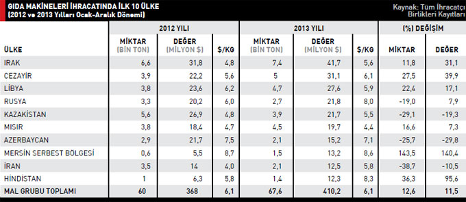 Gıda makineleri, aksam ve parçaları ihracatı 2013 yılının Ocak-Aralık döneminde bir önceki yılın aynı dönemine göre yüzde 11,5 artış gösterdi. 2012 yılının Ocak- Aralık döneminde 368 milyon dolar değerinde ihracat gerçekleştiren sektörün, 2013 yılının aynı dönemindeki ihracatı 410,2 milyon dolar olarak kaydedildi. Gıda makineleri, aksam ve parçaları ihracatında 2013 yılının Ocak- Aralık döneminde en fazla ihracat gerçekleştirilen ülke 41,7 milyon dolarla Irak oldu. Yüzde 31,1 ihracat artışının yaşandığı Irak’a 2012 yılının aynı döneminde 31,8 milyon dolarlık ihracat gerçekleştirilmişti. Irak’ın ardından ikinci sırada bulunan Cezayir’e yönelik gıda makineleri, aksam ve parçaları ihracatı 2013 yılının Ocak- Aralık döneminde 31,1 milyon dolar oldu. Yüzde 39,9 ihracat artışının yaşandığı söz konusu ülkeye 2012 yılının aynı döneminde gönderilen ürünlerin değeri 22,2 milyon dolardı. Listenin üçüncü sırasında yer alan Libya’ya 2012 yılının Ocak- Aralık döneminde 23,6 milyon dolarlık ürün ihraç edilirken bu rakam yüzde 17,1 artarak, 2013 yılının aynı döneminde 27,6 milyon dolar seviyesine yükseldi. Dördüncü sırada bulunan Rusya’ya 2013 yılının Ocak- Aralık döneminde 21,8 milyon dolar değerinde ihracat gerçekleştirildi. 2012 yılının aynı döneminde bu rakam 20,2 milyon dolar seviyesindeydi. Rusya’ya yönelik ihracat artışı yüzde 7,9 oldu. Beşinci sıradaki Kazakistan’a 2013 yılının Ocak-Aralık döneminde 21,7 milyon dolar değerinde gıda makineleri, aksam ve parçaları ihraç edildi. Gıda makineleri, aksam ve parçaları sektöründe en fazla ihracat artışının yaşandığı pazar yüzde 140,4 ile Mersin Serbest Bölgesi oldu. Hindistan yüzde 95,6 ile ikinci, Cezayir ise yüzde 39,9 ile üçüncü sırada yer aldı.