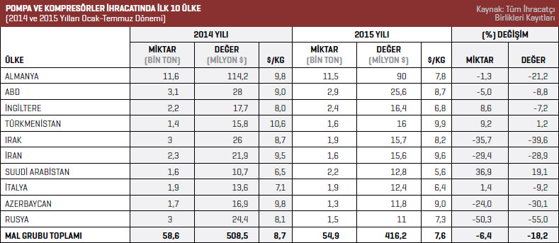 Pompa ve kompresörler ürün grubunda, 2015 yılının Ocak-Temmuz döneminde en fazla ihracat gerçekleştirilen ülke 90 milyon dolarla Almanya oldu. Listenin ikinci sırasında bulunan ABD’ye 2015 yılının Ocak-Temmuz döneminde gönderilen ürünlerin değeri 25,6 milyon dolar olarak kaydedildi. Üçüncü sırada bulunan İngiltere’ye 2015 yılının Ocak-Temmuz döneminde 16,4 milyon dolar değerinde ürün ihraç edildi. Dördüncü sıradaki Türkmenistan’a 2014 yılının Ocak-Temmuz 15,8 milyon dolar değerinde ihracat gerçekleştirilirken 2015 yılının aynı döneminde bu rakam yüzde 1,2 artışla 16 milyon dolar olarak kaydedildi. Beşinci sıradaki Irak’a 2015 yılının Ocak-Temmuz döneminde pompa ve kompresörler kaleminde ihraç edilen ürünlerin değeri 15,7 milyon dolar oldu.