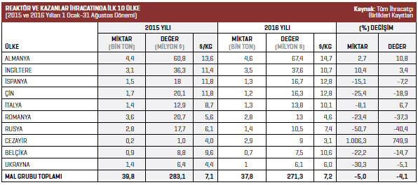 2016 yılının Ocak-Ağustos döneminde Türkiye geneli reaktör ve kazanlar sektöründe en fazla ihracat artışı yüzde 749,9 ile Cezayir’de yaşandı. Bu ülkenin ardından yüzde 10,8 ile Almanya ikinci sırada gelirken yüzde 6,7 ile İtalya üçüncü sırada yer aldı.