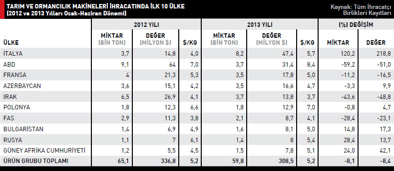 Tarım ve ormancılıkta kullanılan makineler, aksam ve parçaları ürün grubunda 2013 yılı Ocak-Haziran döneminde gerçekleştirilen ihracatın değeri 308,5 milyon dolar oldu. 2013 yılı Ocak-Haziran döneminde tarım ve ormancılıkta kullanılan makineler, aksam ve parçaları kaleminde en fazla ihracat İtalya’ya gerçekleştirildi. Bir önceki yıla göre yüzde 218,8 ihracat artışının yaşandığı İtalya’ya 2012 yılında 14,8 milyon dolar ihracat değerine sahip ürün gönderilirken bu rakam, 2013 yılının aynı döneminde 47,4 milyon dolara yükseldi. Listenin ikinci sırasında yer alan ABD’ye 2013 yılının Ocak-Haziran döneminde 31,4 milyon dolarlık ihracat gerçekleştirildi. Üçüncü sırada yer alan Fransa’ya 2013 yılının Ocak- Haziran döneminde ihraç edilen tarımve ormancılıkta kullanılan makineler, aksam ve parçalarının değeri 17,8 milyon dolar oldu. Dördüncü sıradaki Azerbaycan’a 2012 yılının Ocak-Haziran döneminde 15,1 milyon dolarlık ürün ihraç edilirken bu rakam, yüzde 9,9 artışla 2013 yılının aynı döneminde 16,6 milyon dolar değerine yükseldi. Beşinci sırada bulunan Irak’a 2013 yılının Ocak-Haziran döneminde ihraç edilen tarım ve ormancılıkta kullanılan makineler, aksam ve parçalarının toplam değeri 13,8 milyon dolar oldu. İhracat artışının en fazla yaşandığı ilk üç ülke sıralamasında ise yüzde 218,8 ile İtalya ilk sırada yer alırken yüzde 42,1 ile Güney Afrika Cumhuriyeti ikinci ve yüzde 13,7 ihracat artışıyla da Rusya üçüncü oldu.
