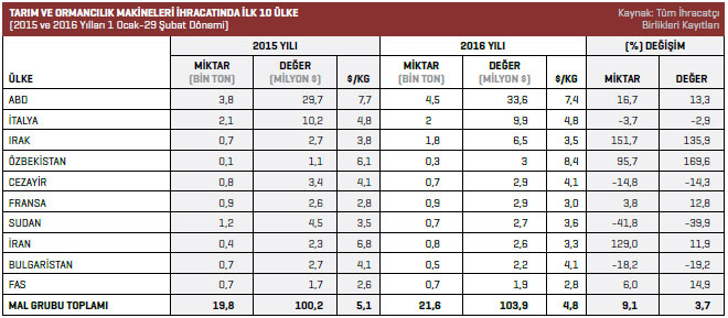 2016 yılının Ocak-Şubat döneminde Türkiye geneli tarım ve ormancılıkta kullanılan makineler, aksam ve parçaları ürün grubunda ihracat artışının en fazla yaşandığı ülke yüzde 169,6 ile Özbekistan oldu. Listenin ikinci sırasında 135,9 ile Irak yer alırken söz konusu ülkeyi yüzde 14,9 ihracat artışıyla Fas üçüncü sırada takip etti.