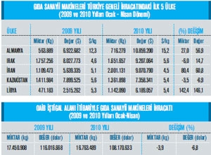 Ülkemiz gıda sanayii makineleri ihracatı 2009 yılı Ocak-Nisan döneminde geçtiğimiz yılın aynı zaman dilimine göre yüzde 6,8 oranında gerileme göstererek 116 milyon 16 bin dolardan 108 milyon 170 bin dolara inmiştir. Gıda sanayii makineleri ihracatı mız ülkeler bazında incelendi- ğinde ise Almanya’nın ilk sırada yer aldığı görülüyor. Söz konusu ülkeye 2009 yılının Ocak-Nisan döneminde 6 milyon 922 bin dolarlık gıda sanayii makineleri ihracatı söz konusu iken 2010 yılının Ocak-Nisan döneminde ise yüzde 56,9 oranında ihracat artış oranı ile 10 milyon 859 bin dolarlık ihracat rakamı yakalanmış durumda. Almanya’nı n ardından gıda sanayii makinelerinde en fazla ihracat yaptığımız ikinci ülke ise Irak olmuş. Bu ülkeye 2009 yılının Ocak-Nisan ayları arasında 8 milyon 27 bin dolarlık gıda sanayii makineleri ihracatı yapılmı şken 2010 yılının aynı dönemine gelindiğinde yüzde 14,7 oranında artışla 9 milyon 207 bin dolarlık ihracat gerçekleştirilmiş. Gıda sanayii makineleri ihracatımızın en fazla olduğu üçüncü ülkenin ise İran olduğu görülüyor. İran’a 2009 yılının Ocak-Nisan döneminde 5 milyon 639 bin dolarlık gıda sanayii makineleri ihracatı varken 2010 yılının eş zaman dilimine gelindiğinde yüzde 60,8 oranında değer artışı yakalanmış ve ihracat rakamı 9 milyon 70 bin dolar olmuş. Gıda sanayii makineleri ihracatı mızın artış hızı oranları ülkeler bazında incelendiğinde ise Uk- rayna’nın yüzde 386,1 oranında ihracat artışı ile ilk sırada yer aldığı görülüyor. Söz konusu ülkeye 2009 yılının Ocak-Nisan döneminde 635 bin dolarlık gı- da sanayii makineleri ihracatı- mız varken 2010 yılının aynı zaman dilimine gelindiğinde 3 milyon 175 bin dolarlık ihracat gerçekleştirilmiş.