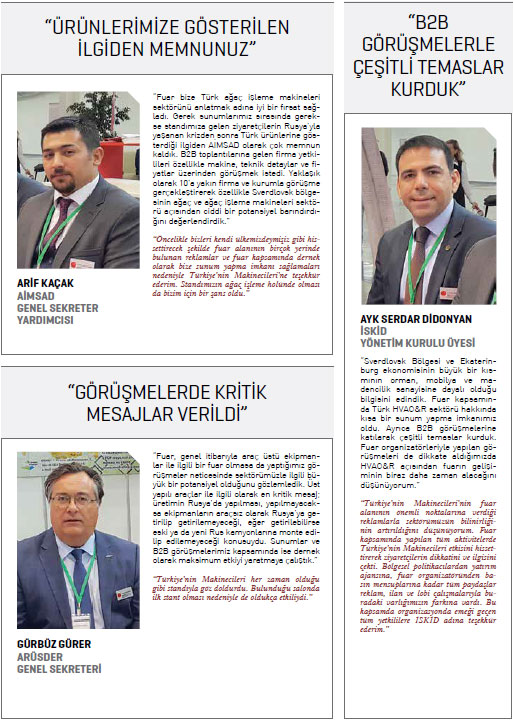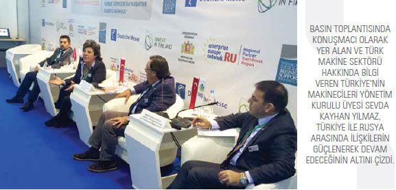 Düzenlenen basın toplantısında konuşmacı olarak söz alan ve Türk makine sektörü hakkında bilgiler veren Türkiye’nin Makinecileri Yönetim Kurulu Üyesi Sevda Kayhan Yılmaz, Türkiye ile Rusya arasında ilişkilerin güçlenerek devam edeceğinin altını çizdi. Türkiye’nin Makinecileri yetkililerinin çeşitli dernek, kurum ve firma temsilcileriyle ikili temaslar kurduğu fuar kapsamında Sverdlovsk Bölgesi Hükümet Başkan Yardımcısı Alexey Orlov, Sverdlovsk Bölgesi Bilim ve Sanayi Bakanı Sergey Perestoronin, Ekaterinburg Fahri Konsolosu Sergey Trofimov, Hannover Belediye Başkanı ve fuar yetkililerinden oluşan bir heyetle de görüşmeler gerçekleştirildi. 20 Eylül tarihinde fuar alanında düzenlenen toplantıda ise MSSP üyesi dernek temsilcileri, sektörleri ve derneklerinin çalışmalarını anlatan birer sunum yaparak katılımcıların sorularını cevaplandırdı. Dernek temsilcileri organizasyonun ikinci günündeyse fuar alanında düzenlenen ikili iş görüşmelerine katıldı. Dört gün süren ve 10 binden fazla kişinin ziyaret ettiği fuar boyunca Türkiye’nin Makinecileri’nin standında ziyaretçi ve katılımcılara Türk makine sektörü hakkında kapsamlı bilgiler verildi. Türkiye’nin Makinecileri gerçekleştirdiği tanıtım faaliyetleri, toplantılar ve çeşitli görüşmelerle Rusya’ya yönelik etkin bir çalışma gerçekleştirdi.
