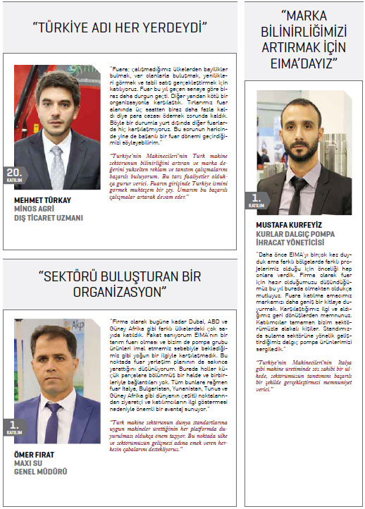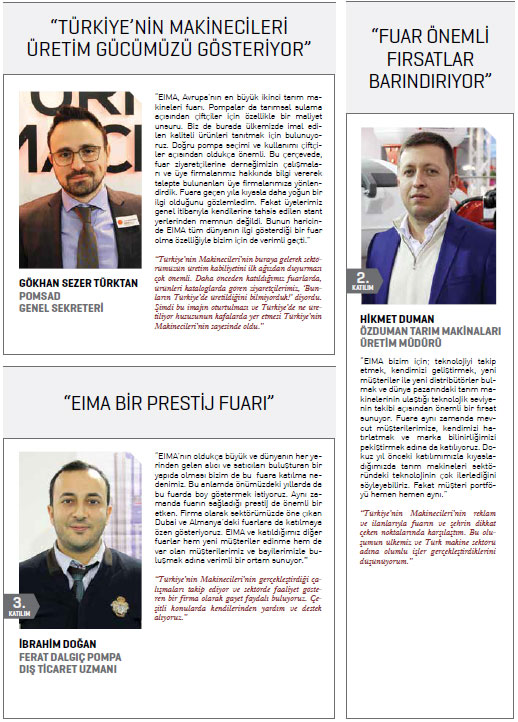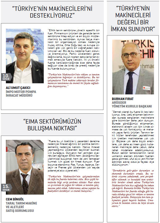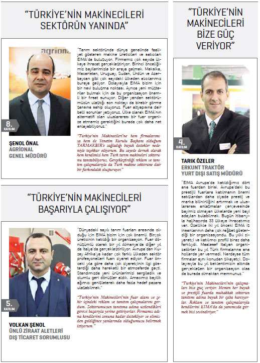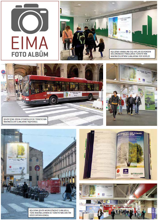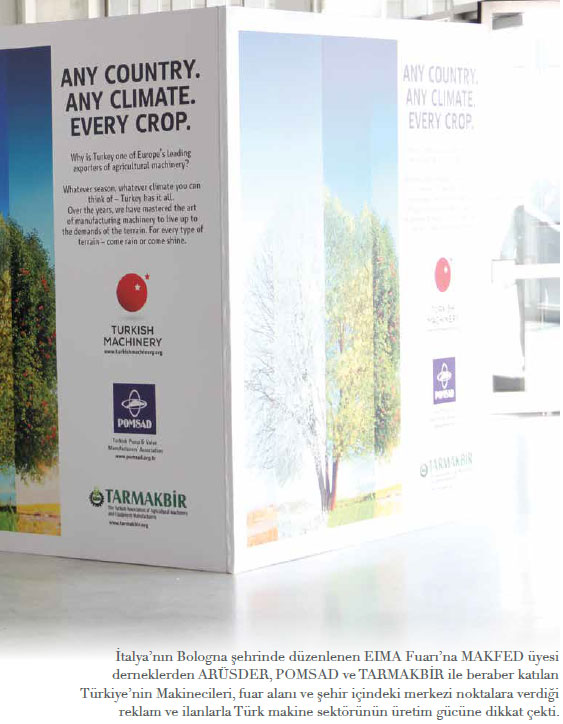 Türkiye’nin Makinecileri, 9-13 Kasım tarihlerinde İtalya’nın Bologna kentinde düzenlenen ve tarım makineleri sektörü açısından dünyanın en prestijli organizasyonları arasında gösterilen EIMA Fuarı’na katılarak Türk makine sektörünün imajının güçlendirilmesine yönelik önemli bir çalışmaya daha imza attı. Beş gün süren fuar boyunca Türk firmaları yeni ürün ve teknolojilerini dünyanın çeşitli ülkelerinden gelen ziyaretçilere tanıtma olanağı elde etti.