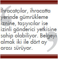 İhracatta Yerinde Gümrükleme: İhracatta yerinde gümrükleme izni sayesinde ihracat eşyasının gümrük işlemleri, izin sahibi firmanın kendi tesislerinde yapılarak ihracat eşyası iç gümrüğe getirilmeden doğrudan sınır gümrük idaresine sevk edilebiliyor. Eşya muayenesinin gerekli olduğu sınırlı sayıdaki durumlarda ise gümrük memurunca firmanın tesislerine gidiliyor. Bir önceki yıl içinde toplam 5 milyon FOB doları tutarında ihracat gerçekleştirmiş olan ve yetkilendirilmiş yükümlü sertifikasına sahip firmaların, bu uygulamadan yararlanması mümkündür.