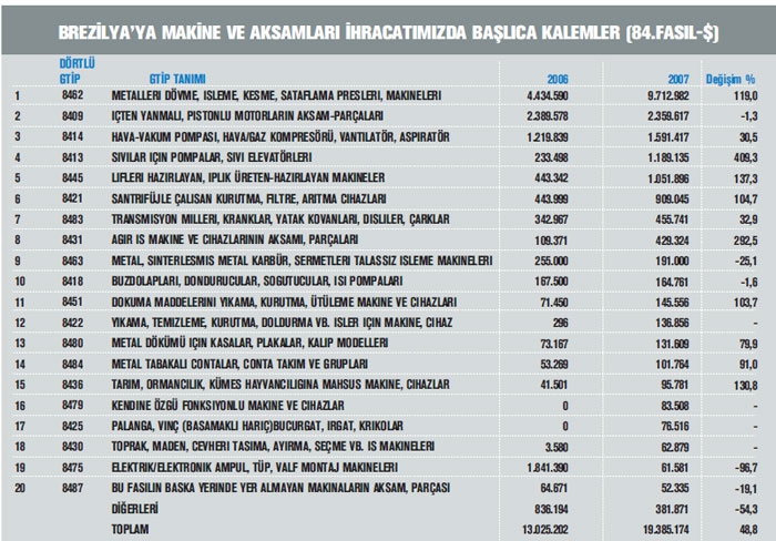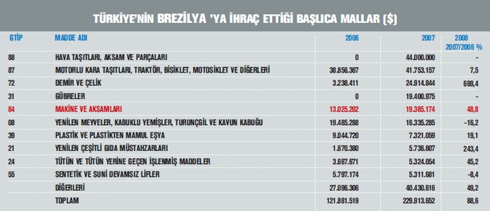 TÜİK verilerine göre Brezilya’ya yönelik olarak OAİB iştigal alanına; 84. fasılda olup, OAİB iştigal alanında bulunmayan GTİP’lerin eklenmesiyle oluşturulan makine sektörü toplamı ihracatı, 2008 yılı Ocak-Eylül döneminde bir önceki yıl eş dönemine göre yaklaşık yüzde 203 artarak 43 milyon dolara ulaşmış durumda. 2008 yılı ilk dokuz aylık dönemde Brezilya’ya yönelik makine sektör toplamı ihracatı nda, yaklaşık 21 milyon dolarlık ihracatı ile “ambalaj makineleri, aksam ve parçaları” mal grubunun ilk sırada yer aldığı görülüyor. 84. fasıl itibariyle sektör ihracatında önemli yer tutan kalemler ise dörtlü GTİP bazında incelendiğinde; 8462 nolu GTİP’de yer alan “Metalleri Dövme, İşleme, Kesme, Sataşama Presleri, Makineleri” nin ilk sırada yer aldığı ve ihracatı nın iki katından fazla artış gösterdiği görülüyor. 4. sırada yer alan ve ihracatı yüzde 409 artan “Pompalar ve AksamParçaları” ürün grubu ise Brezilya’ya makine ihracatımızda kayda değer artış gösteren bir kalem. Makine sektör toplamı itibariyle Türkiye’nin Brezilya’dan ithalatı, 2008 yılı Ocak-Eylül döneminde bir önceki yıl eş dönemine göre yüzde 4,5’lik artışla 127 milyon dolar olarak gerçekleşmiş. Brezilya’dan en fazla ithal edilen mal grubu, 35 milyon dolar ile “vanalar” olmuş. 2007 yılında Türkiye’nin Brezilya’dan 84. fasıl itibariyle en fazla ithal ettiği ürün grubu ise, 56 milyon dolar ile “Hava-Vakum Pompası, Hava/Gaz Kompresörü, Vantilatör, Aspiratör” olurken, onu 40 milyon dolar ile “Dozerler, Greyder, Skreyper, Ekskavatör, Küreyici, Yükleyici vb.” ürün grubu takip etmiş. Sektör ithalatında ilk beş kalem içerisinde en yüksek ithalat artışı ise yüzde 42,1 ile 8413 nolu GTİP’de yer alan pompalar ürün grubunda yaşanmış. SPOT: “ Türk işadamlarının Brezilya’yı daha iyi tanıyarak aktif bir şekilde konuya eğilmeleri, ülkeler arasındaki ticaret hacminin artmasında ve Türkiye açısından ekside olan dengenin düzeltilmesinde önemli rol oynayacağı düşünülüyor. Brezilya ile ülkemiz arasında kurulacak yakın ekonomik işbirliği, Arjantin, Paraguay, Uruguay ve Venezüella’nın üye oldukları geniş pazardan Türk firmalarının daha çok yararlanmasını sağlayacağı da kesin.”