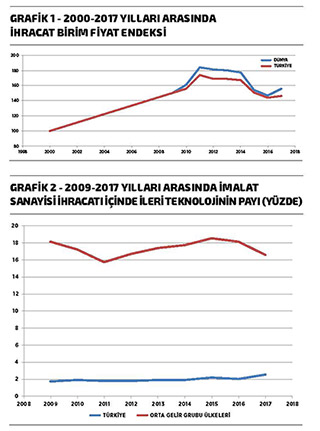 İç talepteki yetersizliği dış pazarlara yönelerek aşmaktan başka çaresi olmayan ekonomik aktörler için ihracatın yalnızca bir ihtiyaç değil aslında bir gereklilik olduğunu bu günlerde bir kez daha görüyoruz. İlk çeyrekte ihracatın büyümeye yüzde 9,5’lik pozitif katkısı, bu durumu net olarak teyit ediyor. İhracattaki rekorlarla gururlanmakta haklıyız, ancak yazının başlığında da belirttiğim gibi ihracat bir sonuç olarak görülmeli ve bizi bu sonuca götüren nedenlerin analizi yapılmalıdır ki sonrasında nereye ve ne kadar gidebileceğimizin öngörüsünü gerçekleştirebilelim. Bu kısa yazımızda, Dünya Bankasının veri setlerini kullanarak Türkiye’nin ihracatındaki gelişmeleri, 2000 yılı ve küresel kriz sonrası olan 2009 yılını baz alarak kısaca analiz edeceğim. Amacım, son dönemde Türkiye’nin büyümesine çok ciddi destek veren ihracatın profilini karşılaştırmalı olarak ele almak. Bunun için Dünya Bankası Ticaret Veri Setinde verisi olan tüm ülkelerden oluşan “dünya ortalaması” ile Türkiye’nin de içinde bulunduğu “üst-orta gelir grubu” ve “orta gelir grubu” ülkelerin ortalamalarını Türkiye rakamlarıyla karşılaştıracağım. Grafik 1’de, 2000 yılı 100 olarak belirlenerek Türkiye ve dünya genelindeki ihracat birim fiyat endeks değerleri karşılaştırılıyor. 2000-2009 yılları arasında yüzde 50 gibi çok ciddi bir artış gösteren ihracat birim fiyatında Türkiye’nin performansı bu dönemde dünya ortalamasına eşit. Tüm dünyada ve Türkiye’de de 2000’li yıllardan küresel krize kadar bir yandan dünya ticareti artarken aynı zamanda da ihracatın birim fiyatı artış göstermiş. Krizden sonrasında 2011 yılına kadar birim fiyat artışı devam etmiş ve sonrasında düşüş trendine girmiş. 2015 yılında dünya ve Türkiye’nin ihracat birim fiyatı 2009 yılına gerilerken, son veri yılı olan 2017’de dünya ihracat birim fiyatı yeniden 156’ya tırmanmış, Türkiye’de ise 2009 fiyatının altında kalmaya devam etmiş.