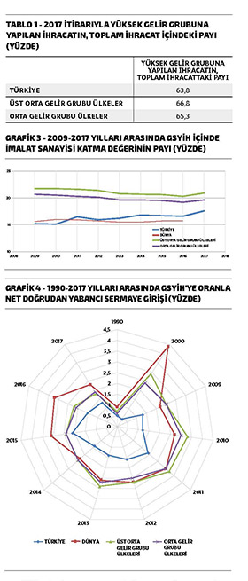 Tüm yıllarda Türkiye’nin ihracat birim fiyatının dünya ortalamasının altında kalması ve aynı zamanda rakamın azalan bir trend içinde olması, ihracatın deseninin incelenmesi gerekliliğini beraberinde getiriyor. Grafik 2’de ise Türkiye ile rekabet halindeki ülkelerin yer aldığı orta gelir grubunun ihracatında ileri teknolojinin payı gösteriliyor ve yıllar itibarıyla değişimi Türkiye ile karşılaştırılıyor. Aslında hepimiz bu oranın düşük olduğunu biliyoruz ancak dikkat çeken nokta, 2017’de Türkiye’nin yüzde 2,5’e yükselen değeri: 2017’de orta gelir grubu ülkelerin ihracatında ileri teknolojinin payı gerilerken, Türkiye’de bu oran yükselmiş. Halen makas oldukça açık olmakla birlikte son dönemdeki gelişmeler, teknoloji grupları bazında kapasite kullanım oranları ve sanayi üretim verileri Türkiye’de ileri teknoloji sektörlerinin oldukça iyi bir performans sergilediğini ortaya koyuyor. Burada, “İhracatta ne satıyoruz?” sorusu kadar “Nereye satıyoruz?” sorusunun cevabı da önemli. Tablo 1’de Türkiye, üst orta gelir grubu ülkeler ve orta gelir grubunun ihracatlarının ne kadarlık kısmını yüksek gelir grubuna yaptıkları 2017 yılı itibarıyla gösteriliyor. Buna göre Türkiye ihracatının yüzde 63,8 gibi önemli bir oranını yüksek gelir grubuna yaparken, bu oranın halen arttırılması gerektiği de anlaşılıyor. Ancak yine de oranın yüksekliği, başta AB gibi standartları yüksek ve rekabetçi pazarlara Türkiye’nin önemli ihracat kabiliyetinin anlaşılması açısından önem arz ediyor.