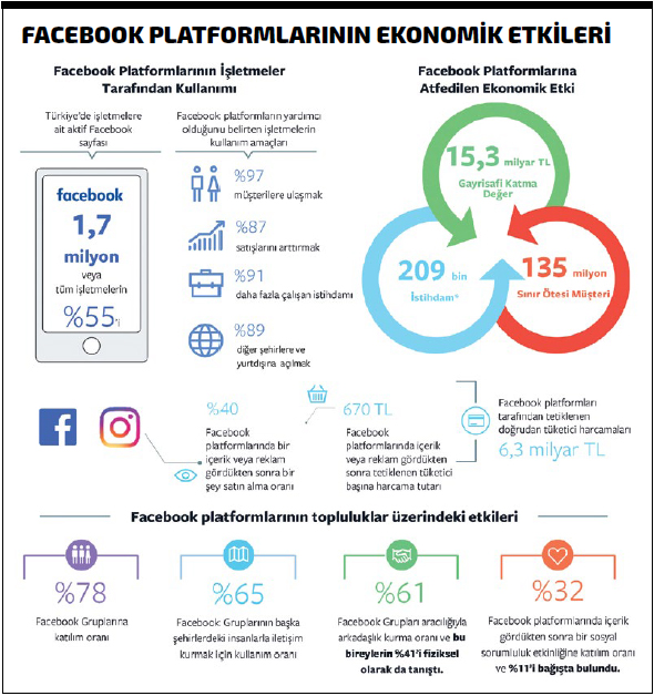 Facebook, Instagram, WhatsApp ve Facebook Messenger’ın aralarında bulunduğu Facebook platformları, dünya çapında milyonlarca işletme ve bireye ulaşarak iş yapma ve iletişim biçimlerini değiştirirken, işletmelerin satış ve pazarlama yetkinliklerini geliştirerek sınır ötesi müşterilere ulaşmalarına yardım ediyor, dijitalleşmeyle verimliliğin artmasını sağlayarak güçlü ekonomik etkiler meydana getiriyor. Örneğin, Türkiye’deki Facebook topluluğuna daha iyi hizmet sunabilmek adına başlatılan “Sınırları Aşan Türkiye” projesinin ilk adımlarından birini oluşturan ve Deloitte Türkiye’nin Facebook ve Türkiye’yle ilgili hazırladığı “Dijital Köprüler: Sınırları Aşmanın En Kısa Yolu” başlıklı ekonomik ve sosyal etki raporuna göre, Türkiye’deki insanların yüzde 80’i Facebook üzerinden ülkedeki en az bir işletmeyle bağlantı kurmuş durumda. 1,7 milyondan fazla KOBİ’nin Facebook’ta bir işletme sayfası olduğunu, bu rakamın ise Türkiye’deki KOBİ sayısının yüzde 55’ine karşılık geldiğini ortaya koyan rapora göre Türkiye’deki işletmeler Facebook platformları aracılığıyla Türkiye ekonomisine 15,3 milyar TL katma değer sağlıyor ve bu katkılar sonucunda 209 bin kişilik istihdam sağlanıyor.