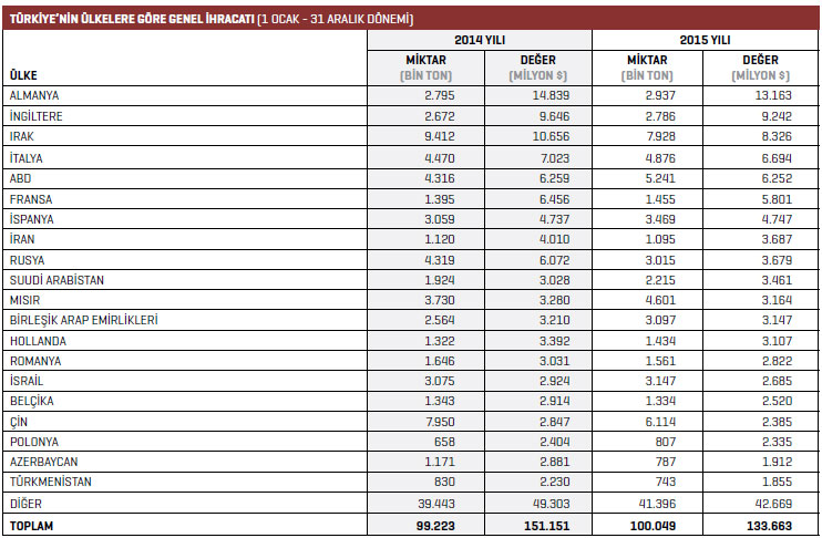2015 yılının Ocak- Aralık döneminde 279,8 milyon dolar değerinde ihracat gerçekleştirildi.