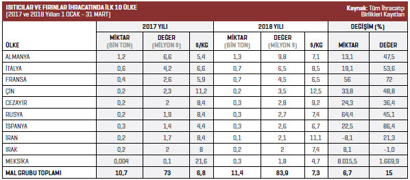Isıtıcılar ve fırınlar ürün grubunda 2017 yılının Ocak- Mart döneminde 73 milyon dolarlık ihracat gerçekleştirilirken, 2018 yılının aynı döneminde bu rakam yüzde 15 artışla 83,9 milyon dolara yükseldi.