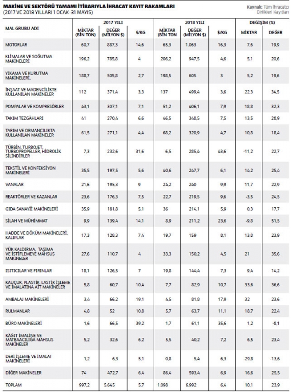 TÜRKİYE’NİN MAKİNE İHRACATI 2018 YILININ OCAK-MAYIS DÖNEMİNDE 7 MİLYAR DOLAR SEVİYESİNDE KAYDEDİLDİ. 2017 YILININ AYNI DÖNEMİNDE BU RAKAM 5,6 MİLYAR DOLARDI. TÜRKİYE’NİN MAKİNE İHRACATI, MAYIS AYININ SONUNDA, GEÇEN YILIN AYNI DÖNEMİNE GÖRE YÜZDE 23,9 ARTTI.,