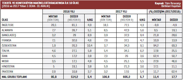 Tekstil ve konfeksiyon makineleri sektöründe 2017 yılında en fazla ihracat gerçekleştirilen ülke 77,1 milyon dolarla İngiltere oldu. Listenin ikinci sırasında bulunan Almanya’ya 2016 yılında 39,7 milyon dolarlık ihracat gerçekleştirilirken 2017 yılında bu rakam yüzde 19,1 artışla 47,3 milyon dolar olarak kaydedildi. Listenin üçüncü sırasında yer alan Bangladeş’e 2016 yılında 29 milyon dolar değerinde ihracat gerçekleştirilirken 2017 yılında bu rakam yüzde 28,6 artışla 37,3 milyon dolar oldu. Dördüncü sıradaki Fransa’ya 2016 yılında 32,6 milyon dolar değerinde ihracat gerçekleştirilirken 2017 yılında bu rakam yüzde 13,9 artışla 37,1 milyon dolar olarak kaydedildi. Listenin beşinci sırasında bulunan Özbekistan’a yönelik tekstil ve konfeksiyon makineleri ihracatı 2016 yılında 20,3 milyon dolarken 2017 yılında yüzde 69,3 artışla 34,3 milyon dolar olarak kaydedildi.