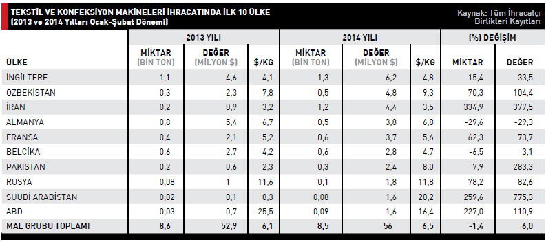 Tekstil ve konfeksiyon makineleri ürün grubu ihracatı 2014 yılının Ocak-Şubat döneminde, 2013 yılının aynı dönemine göre yüzde 6 artış göstererek 56 milyon dolar değerine ulaştı. Tekstil ve konfeksiyon makineleri mal grubunda 2013 yılının Ocak-Şubat döneminde ihraç edilen ürünlerin değeri 52,9 milyon dolar seviyesindeydi. Tekstil ve konfeksiyon makineleri sektöründe 2014 yılının Ocak-Şubat döneminde en fazla ihracat gerçekleştirilen ülke 6,2 milyon dolarla İngiltere oldu. Yüzde 33,5 artışın yaşandığı söz konusu ülkeye, 2013 yılının aynı döneminde 4,6 milyon dolar değerinde ürün ihraç edilmişti. Listenin ikinci sırasında yer alan Özbekistan’a yönelik tekstil ve konfeksiyon makineleri ihracatı 2014 yılının Ocak-Şubat döneminde, geçen yılın aynı dönemine göre yüzde 104,4 artış gösterdi. 2013 yılının aynı döneminde 2,3 milyon dolarlık ürün gönderilen Özbekistan’a, 2014 yılının Ocak-Şubat döneminde ihraç edilen ürünlerin değeri 4,8 milyon dolara yükseldi. Listenin üçüncü sırasında bulunan İran’a 2013 yılının Ocak-Şubat döneminde 923 bin dolarlık ihracat gerçekleştirilirken bu rakam, 2014 yılının aynı döneminde yüzde377,5 artışla 4,4 milyon dolar olarak kayda geçti. Dördüncü sıradaki Almanya’ya 2014 yılının Ocak-Şubat döneminde 3,8 milyon dolarlık tekstil ve konfeksiyon makinesi ihraç edildi. Listenin beşinci sırasında yer alan Fransa’ya 2014 yılının Ocak-Şubat döneminde 3,7 milyon dolar değerinde ihracat gerçekleştirildi. 2013 yılının aynı döneminde bu rakam 2 milyon dolar seviyesindeydi.Fransa’ya yönelik ihracat artışı yüzde 73,7 oldu. Tekstil ve konfeksiyon makineleri sektöründe en fazla ihracat artışı yüzde 775,3 ile Suudi Arabistan’da yaşandı. Suudi Arabistan’ın ardından yüzde 377,5 ile İran gelirken yüzde 283,3 ile Pakistan üçüncü sırada bulunuyor.