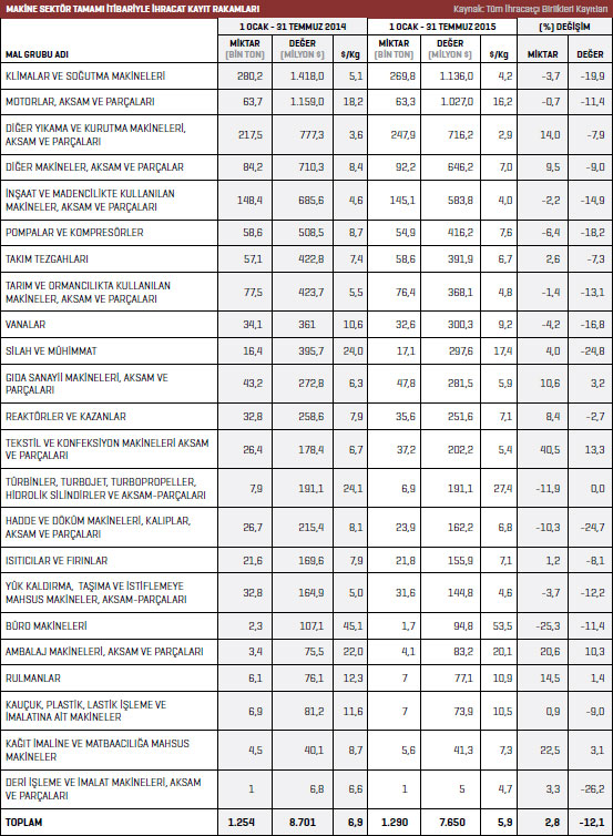 makineleri oldu. 2015 yılının Ocak- Temmuz döneminde söz konusu ürün grubunda gerçekleştirilen ihracatın değeri 1,1 milyar dolar olarak kaydedildi. Listenin ikinci sırasında bul