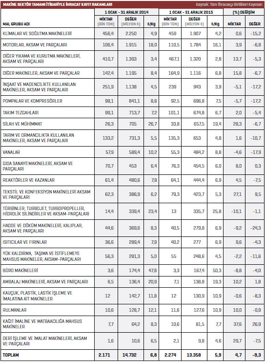 Makine sektöründe 2015 yılı Ocak- Aralık döneminde en fazla ihracat gerçekleştiren alt sektör klimalar ve soğutma makineleri oldu. Yıl boyunca söz konusu ürün grubunda gerçekleştirilen ihracat 1,9 milyar dolar olarak kaydedildi. Listenin ikinci sırasında bulunan motorlar, aksam ve parçaları kaleminde 2015’te 1,7 milyar  dolar değerinde ihracat gerçekleştirildi. Geçtiğimiz yılın ocak-aralık dönemi itibariyle makine sektöründe en fazla ihracat gerçekleştiren üçüncü kalem ise 1,3 milyar dolarlık ihracat değeriyle diğer yıkama ve kurutma makineleri, aksam ve parçaları oldu.