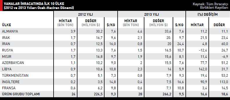 Vanalar sektörü ihracatı 2013 yılının Ocak-Haziran döneminde, 2012 yılının aynı dönemine göre yüzde 18,6 artış kaydederek 266,2 milyon dolar değerine ulaştı. Vanalar ürün grubunda 2012 yılının aynı döneminde ihraç edilen ürünlerin değeri 224,5 milyon dolardı. Vanalar mal grubunda 2013 yılı Ocak- Haziran döneminde en fazla ihracat gerçekleştirilen ülke 11,6 milyon dolarla Almanya oldu. Yüzden 11,1 artışın yaşandığı söz konusu ülkeye 2012 yılının aynı döneminde 30,2 milyon dolar değerinde ürün ihraç edilmişti. Listenin ikinci sırasında bulunan Irak’a yönelik vanalar ihracatı yüzde 23,4 artış gösterdi. 2012 yılının Ocak-Haziran döneminde 16,7 milyon dolarlık ürün gönderilen Irak’a, 2013 yılının aynı döneminde ihraç edilen ürünlerin değeri 20,6 milyon dolara yükseldi. Listenin üçüncü sırasında yer alan İran’a 2012 yılının Ocak-Haziran döneminde 12,5 milyon dolarlık ihracat gerçekleştirilirken bu rakam, 2013 yılının aynı döneminde yüze 60 artışla 20 milyon dolar olarak kayda geçti. Dördüncü sıradaki Rusya’ya 2013 yılı Ocak-Haziran döneminde 16,5 milyon dolarlık ihracat gerçekleştirildi. Yüzde 24,7 ihracat artışının gerçekleştiği söz konusu ülkeye 2012 yılının aynı döneminde gönderilen ürünlerin değeri 13,3 milyon dolar seviyesindeydi. Listenin beşinci sırasında yer alan Mısır’a 2013 yılının Ocak-Haziran döneminde 15,6 milyon dolar değerinde ihracat gerçekleştirildi. Vanalar sektöründe en fazla ihracat artışı yüzde 113 ile İngiltere’de yaşandı. İngiltere’nin ardından yüzde 60 ile İran gelirken yüzde 53,2 ile Türkmenistan  üçüncü sırada bulunuyor.