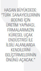 Boeing’in Türkiye’de 200’den fazla uçağı bulunduğunu da hatırlatan Büyükdede, Türkiye’nin amacının sadece uçak almak değil, havacılık ve uzay sanayisinde yer edinmek olduğunu vurgulayarak, “Bugün insansız hava araçlarımızı yapabiliyoruz. Bundan 100 yıl önce uçaklarımızı da yapabiliyorduk. Bugün yeni nesil uçakların parçalarının öncelikle Türkiye’de üretilmesi, hem dünyada bunları kullanan ülkelerin ihtiyaçlarını karşılayacak yan sanayilerin Türkiye’de oluşmasını hem de Türk sanayicilerin havacılık ve uzay sanayisini daha hızlı öğrenmesini sağlayacak. Onun için Boeing yetkilileriyle bir araya geldik. Boeing dünyanın her yerinden milyonlarca parça satın alıyor” dedi.