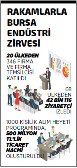 faaliyetler ve ziyaretçi sayısıyla makine sektörünün marka fuarlarından biri olmaya devam eden Bursa Endüstri Zirvesinde 68 ülkeden binin üzerindeki iş insanının katıldığı alım heyeti programları da gerçekleşirken, oluşan ticaret hacmi ise yaklaşık 500 milyon TL olarak açıklanıyor.